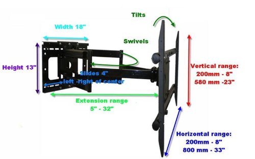 This Solidmounts UADD-850 Dual Arm Articulating Swing-Arm TV wall mount is great news for owners of flat-panel TVs. Heavy Duty: It's designed to safely and securely support large displays 42" to 58". This mount is easy to install and use, and combines full swivel and tilt capabilities to optimize viewing for any Plasma/LCD display. Its rugged simplicity provides a balance of solid construction with ease of use. The Universal Adapter design allows installation of virtually any 37" to 58" Plasma/LCD in just minutes!. This wall-mount supports Displays up to 150 lbs. This mount combines smart engineering with outstanding fit and finish. Extends 32" which is virtually unheard of.